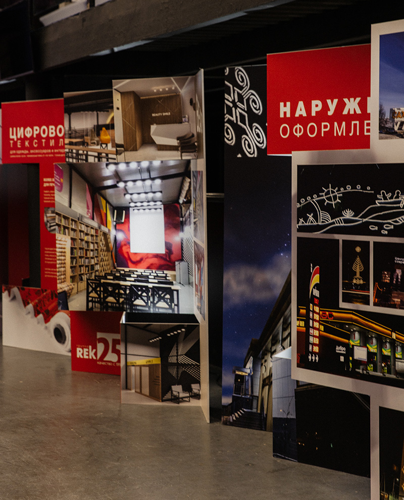 Центральным элементом оформления стала шестиметровая текстильная композиция с сублимационной печатью. Дополнительно была создана масштабная «гармошка» из пенополистирола размером 9×3 м с уф-печатью, предназначенная для демонстрации основного оборудования компании. На противоположной стороне зала разместили конструкции с презентацией лучших реализованных проектов по разным направлениям.