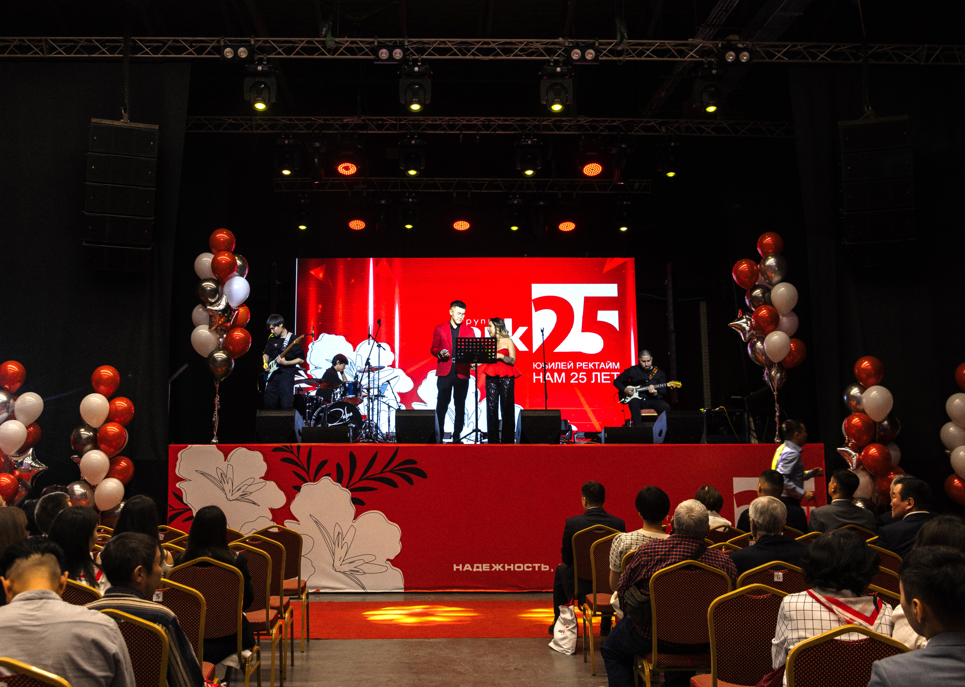 Оформление 25-летнего юбилея компании Ректайм. Основной задачей было создать праздничную атмосферу для гостей и команды, оформить пространство в фирменном стиле, подчеркнуть достижения компании и подвести итоги пройденного пути.