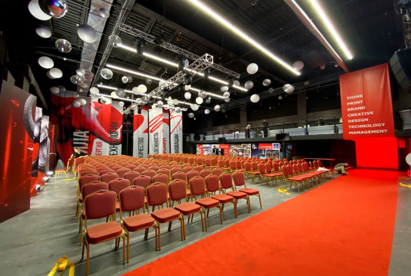 Центральным элементом оформления стала шестиметровая текстильная композиция с сублимационной печатью. Дополнительно была создана масштабная «гармошка» из пенополистирола размером 9×3 м с уф-печатью, предназначенная для демонстрации основного оборудования компании. На противоположной стороне зала разместили конструкции с презентацией лучших реализованных проектов по разным направлениям.